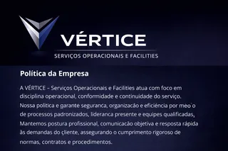 Trabalho com processos padronizados, prevenção de riscos e disciplina operacional, garantindo continuidade do serviço, controle e confiabilidade. As equipes são formadas por profissionais com perfil operacional, incluindo ex-militares, sempre dentro do escopo contratado e alinhados às normas do cliente.